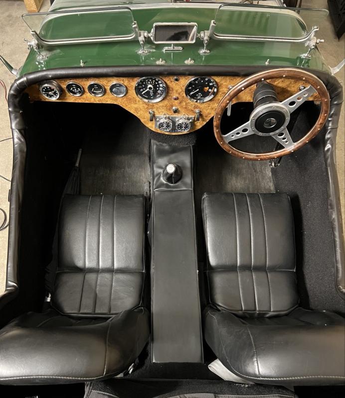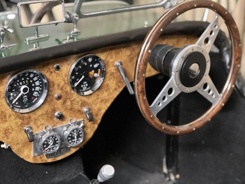 Dieser Burlington Arrow ist auf einem Triumph Herald Chassis aufgebaut und ist nicht wie die meisten mit GFK panels gebaut, sondern mit Aluminium panels. Das schöne Holzarmaturenbrett mit seinen zeitgenössischen Armaturen ist übersichtlich und sehr gut erhalten.