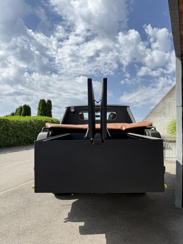 Einzelanfertigung aus dem Hause Emil Frey AG. Auf Wunsch eines passionierten Jägers wurde dieses Fahrzeug erbaut. Das Fahrzeug wurde komplett revidiert und mit Detail's erweitert. Die Kosten belaufen sich dafür bei fr. 40'000.00 Hinter den beiden Haupttüren befinden sich ebenfalls 2 Türelemente, die von innen zu öffnen sind. Dadurch ergibt sich im Fahrerhaus zusätzlichen Platz. Im Heck befindet sich eine vollständig ausziehbare Schublade, worin Gepäck absolut trocken transportiert werden kann. Ein Fahrzeug der Extraklasse für Meschen, die etwas Besonderes suchen und dabei den Anspruch haben, gegen den Strom zu laufen. Das Auto bietet Fahrspass, das seinesgleichen sucht. Beim Fahren sind dir positive Blicke, Daumen hoch und beim Tanken freundliche Gespräche garantiert.